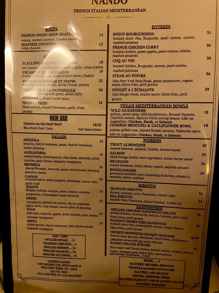 “ Picture this: you just spent your whole Saturday at the MET, and you and your friends are starving. It's 7:30 pm (prime dinner time) and you made no dinner reservations. The restaurant you were originally gonna go to just gave you a 90 minute wait. You're searching for another restaurant to go to, and your friend finds an upper scale Italian place across the street. You go "Well, what other options do we have?" And you decide to check it out. That was the situation me and my two buddies were in last night. We were tired, hungry, and kinda demoralized. So when we walked into Osteria Nando and were seated right away (despite it being a busy Saturday night) we knew we were in for a treat. Service was beyond impeccable. Despite it being a packed dinner service, my party and I didn't have to wait long for service. Our server was friendly and charismatic, and we honestly felt right at home despite not knowing this place existed 15 minutes before. Food and drinks came out quickly, and they were perfect. We ordered the Steak au poivre and lobster ravioli, alongside a few cocktails. The steak was cooked beautifully and seasoned to perfection. Even the fries were seasoned well. The lobster ravioli was to die for, and the server even brought over some shredded parmigiana. The drinks were a bit on the stronger side, which can be a plus or minus depending on your taste. And to top it all off, our serve brought us a tiramisu on the house! It was delicious of course. I'm not sure when I'll be on the upper east side again, but when I do come by that neck of the woods, Osteria Nando will definitely be one of my stops for the day. ”